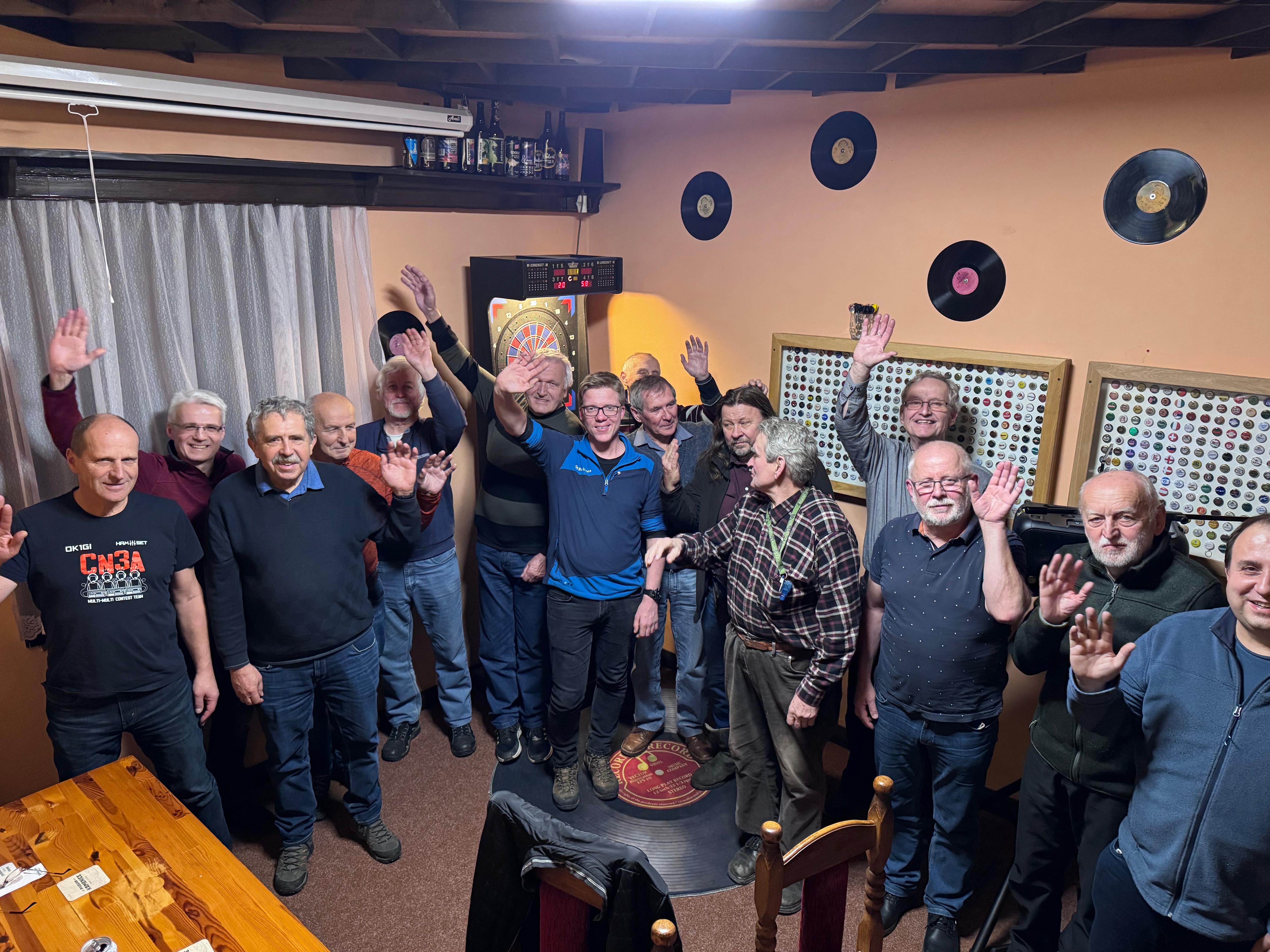 Téhož dne proběhlo i setkání místních kolektivek OK1KTW, OK1KUO, OK1KOK a dalších přátel v útulné hospůdce. Na výzvu fotografa ať zamáváme na pozdrav se zrovna obracím a říkám nejbližším "chlapi pozor, ať to nevypadá že hajlujeme" Hi. ( na jejich případnou politickou kariéru by to mělo neblahý vliv). Hlavně nezdvihat pravou, radši obě a ne moc vysoko.